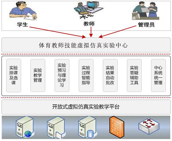 体育教师技能虚拟仿真实验教学管理平台在校园网络的基础上,构建统一的用户管理、资源管理和统一权限管理的虚实一体化实验管理和共享平台。平台主要包括实验中心门户网站、实验教学管理系统、虚拟仿真实验资源系统、实验室开放预约管理系统。其结构如下图。
