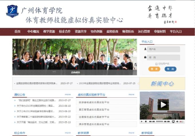体育教师技能虚拟仿真实验教学中心门户网站,对外公布中心教学信息、中心新闻、中心通知公告、中心介绍、实验课程、教学平台、仿真实验、教学资源等,是教学平台各系统功能的链接窗口,注册用户通过预约登记的方式使用实验教学信息化平台上的教学资源。本平台信息同时通过校园门户网站对校内外公布,并在校园网门户提供了对本平台的链接。如图2.3.2-1所示。